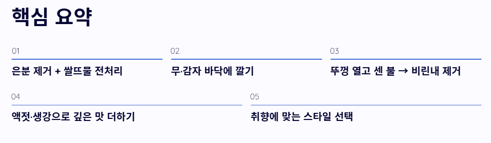 - 비린내 제거를 위해 은분을 제거하고 쌀뜨물에 담그는 전처리가 필수입니다.