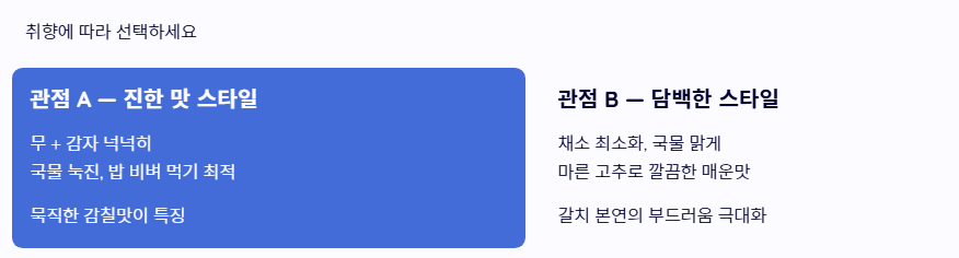 - 관점 B: '갈치 본연의 담백함'을 살리는 깔끔한 스타일 채소를 최소화하고 국물을 맑게 잡아 갈치 살의 부드러움을 극대화합니다. 간을 약하게 하고 고춧가루 대신 마른 고추로 깔끔한 매운맛을 내는 갈치조림 맛있게 하는 법을 지향하는 관점입니다.