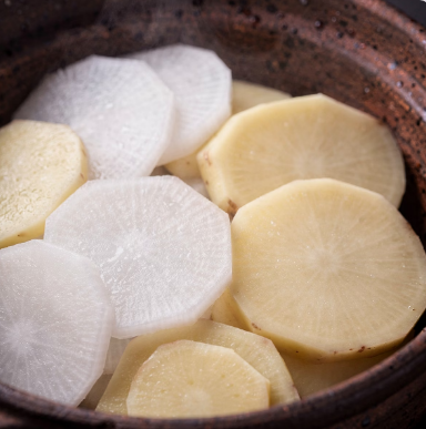 - 무와 감자를 바닥에 깔아 시원하고 걸쭉한 감칠맛을 동시에 잡습니다.
